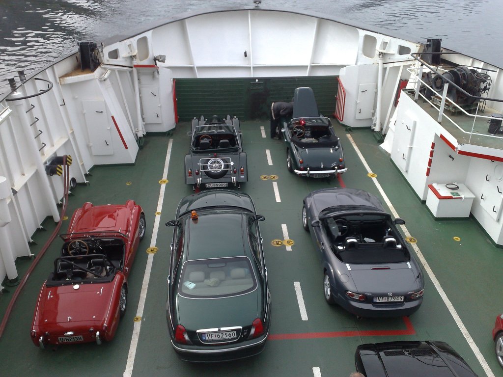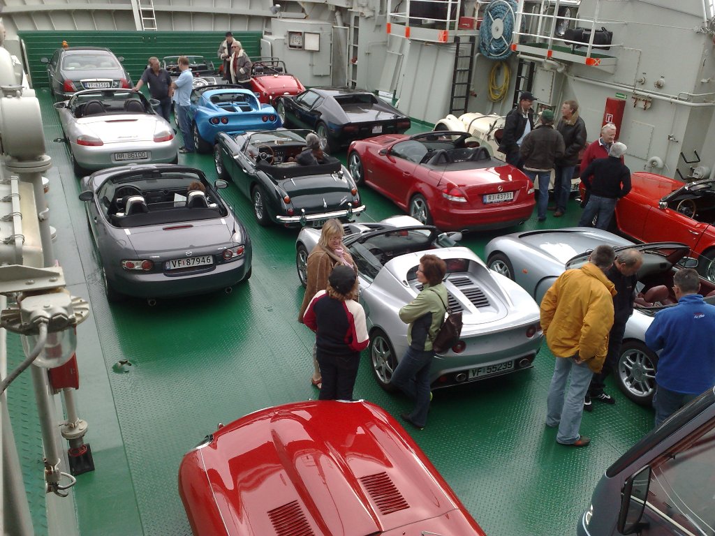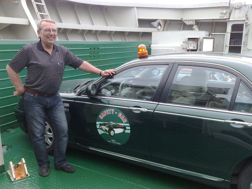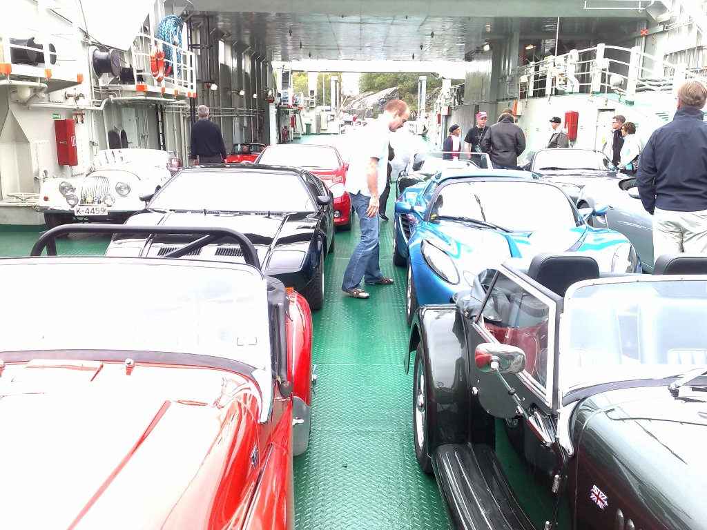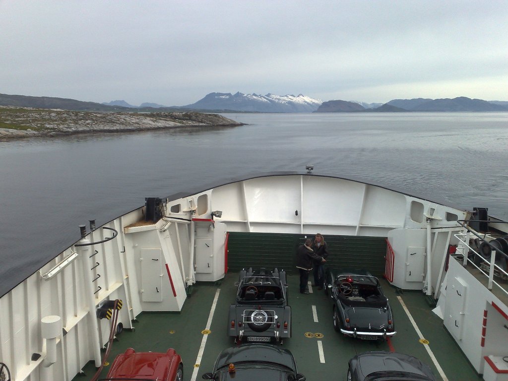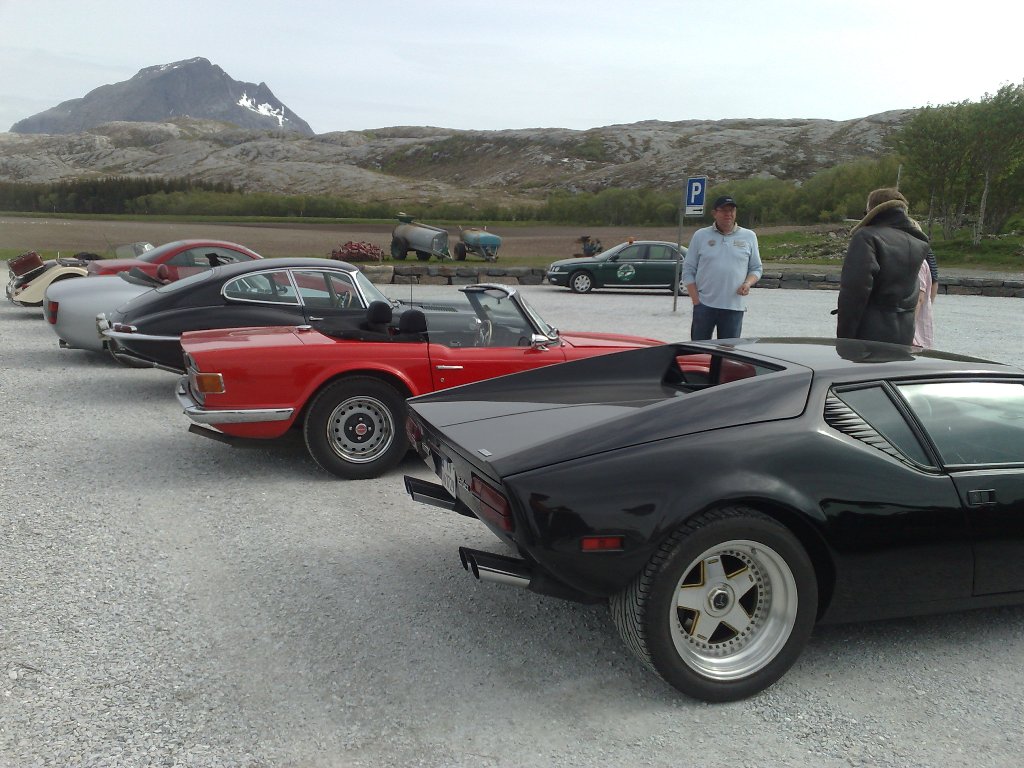 Fredagens siste etappe gikk via flotte veier og en ferje til Brønnøysund hvor vi skulle ha base for natten. Fra ferjeleiet i Vennesund fikk vi selskap av en lokal NSK-medlem i hans strøkne 1973-modell De Tomaso Pantera, nylig importert fra USA.
