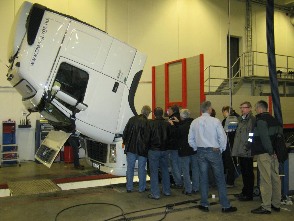 Så gikk turen inn på det nye verkstedet, som er blant Trøndelags største med en total lengde på 35 meter og med plass til 5 semitrailere samtidig. Her fikk vi vite mye om hvordan service, vedlikehold og reparasjoner på tunge kjøretøyer foregår. Spesielt interessant var det å se nærmere på en ny Volvo lastebil med 16 liters motor, luftfjæring og alle fasiliteter. Enkelte lurte seg til og med til en tur opp i førerhuset. En ganske annen tilværelse bak rattet enn på våre små sportsbiler.