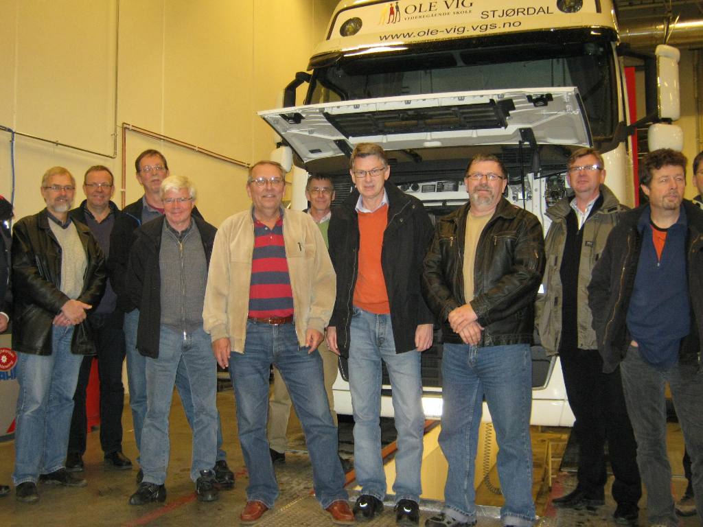 Så gikk turen inn på det nye verkstedet, som er blant Trøndelags største med en total lengde på 35 meter og med plass til 5 semitrailere samtidig. Her fikk vi vite mye om hvordan service, vedlikehold og reparasjoner på tunge kjøretøyer foregår. Spesielt interessant var det å se nærmere på en ny Volvo lastebil med 16 liters motor, luftfjæring og alle fasiliteter. Enkelte lurte seg til og med til en tur opp i førerhuset. En ganske annen tilværelse bak rattet enn på våre små sportsbiler.