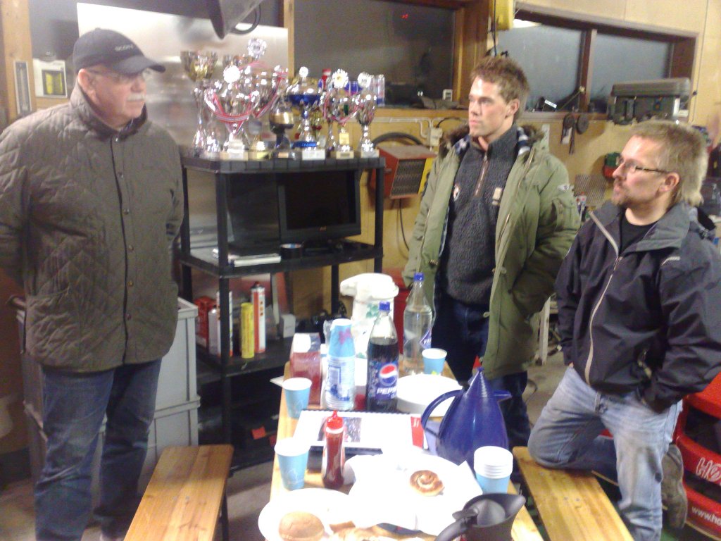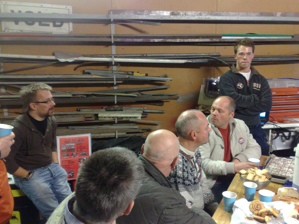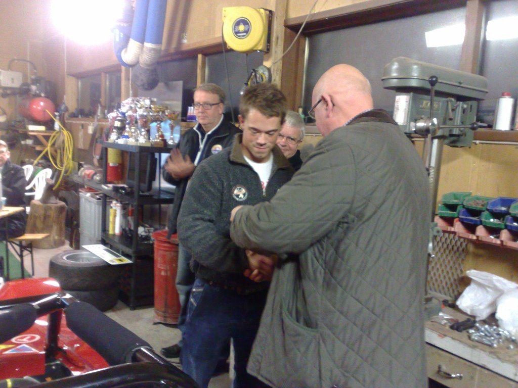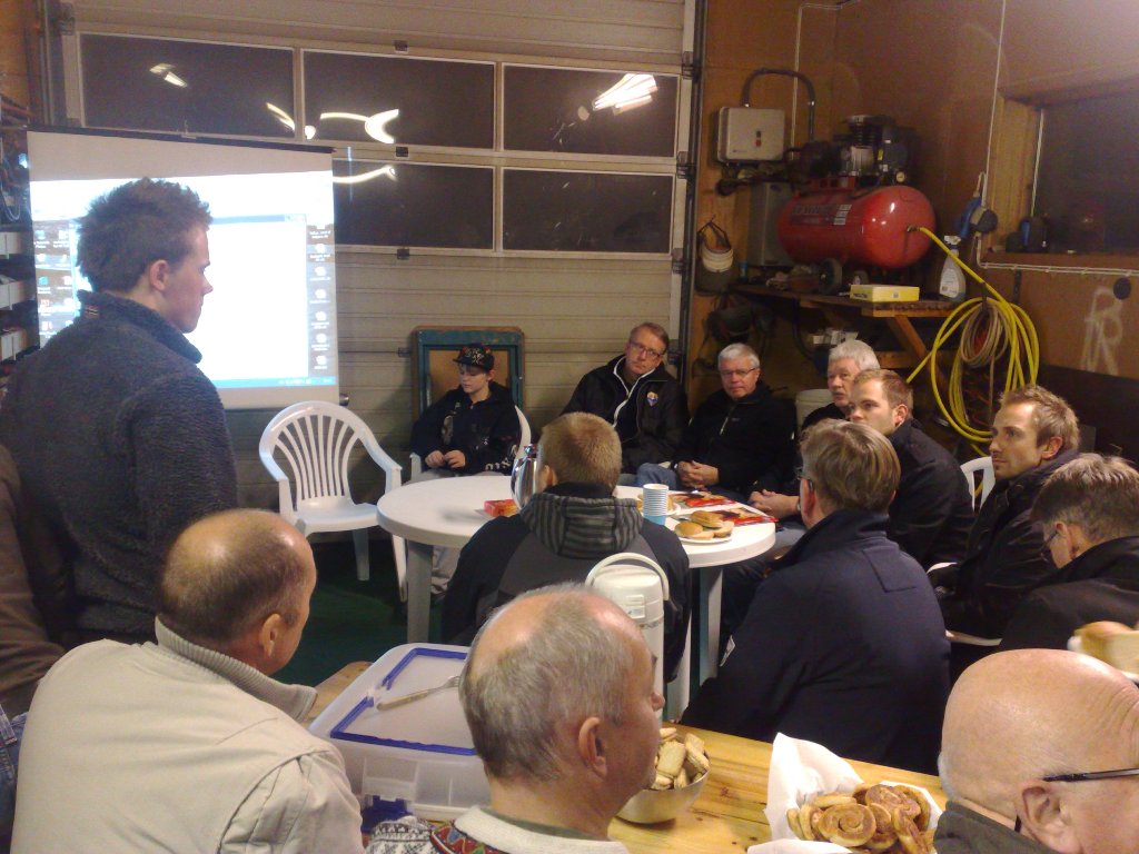 Etter at det var ønsket velkommen og kaffe og kaker var plassert ut fikk vi på storskjerm se bilder og en filmsnutt om teamets satsning i motorsportklassen Seven Racing. Den talentfulle sønnen Daniel er sjåfør og gjør det meget bra med blant annet 2.plass i årets NM og Nordisk Masters. Resten av teamet består av faren Arild og to kompiser av sjåføren som er dyktige mekanikere. Ingen tvil om at det legges ned mye tid og penger i en brennende bilinteresse. De er også i gang med å bygge en bil til den yngre sønnen Aleksander, som i likhet med sin bror allerede har en solid bakgrunn i gokart-klasser.