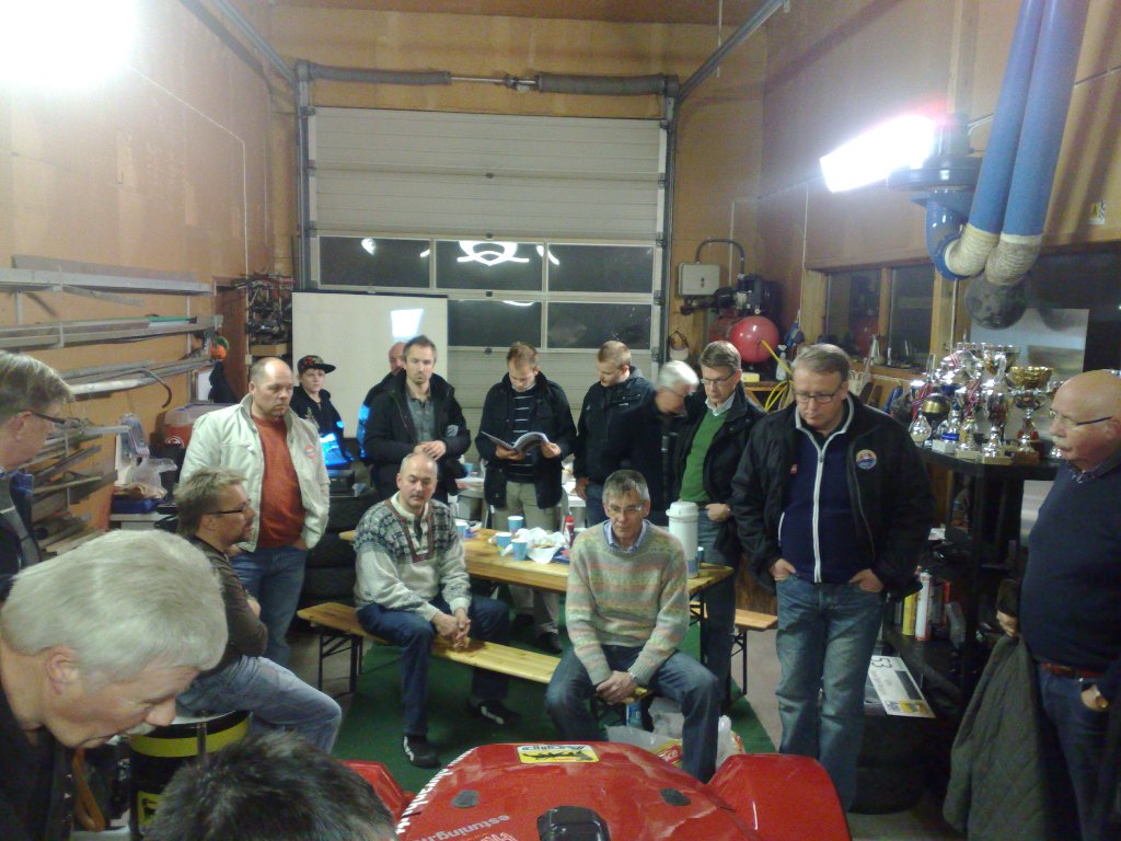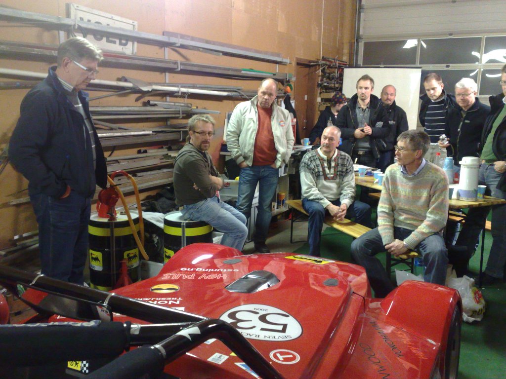 13 biler og 20 personer møtte opp til et fartsfylt og interessant møte med tema racing. Kort samling på Esso Moholt der en del hadde møtt opp for felleskjøring nordover. Det var en fint høstvær denne kvelden og et ivrig medlem i rød Jaguar imponerte spesielt med å kjøre toppløst både til og fra møtet i de tross alt ikke mange plussgradene. En frisk kjøretur langs E6 før vi møtte de resterende deltagerne utenfor garasjen som den meget bilinteresserte familien Nordgaard disponerer noen kilometer nord for Stjørdal.
