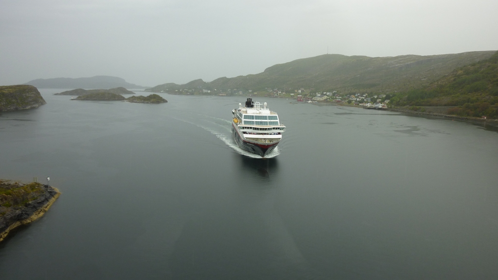 Turen gikk videre via Åfjord ut til Stokkøya. Kjøreruta var godt timet, da vi var framme ved broa over til Stokkøya var det akkurat nok tid til å parkere og gå opp på toppen av brua, før vi fikk se nordgående Hurtigrute passere under broa, og gå videre gjennom spektakulært kystlandskap ut mot yttersida av øya.
